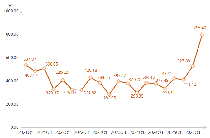 2025年四季度,浙江省排污权交易指数收于795.40点,环比上升50.68%,同比上升136.73%。