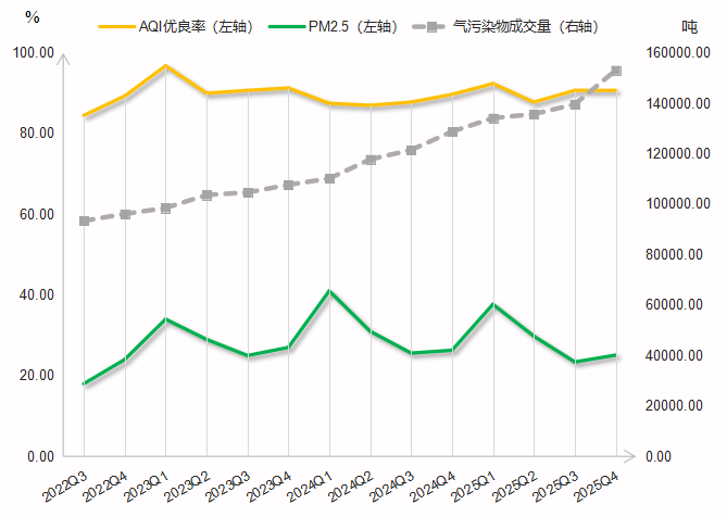 2025年四季度,浙江省III类水质以上省控断面比例为99.70%,空气质量优良率为90.90%,细颗粒物浓度(PM2.5)为25.10微克/立方米。从环境改善情况来看,水污染物成交量(由化学需氧量和氨氮成交量构成)与III类水质以上省控断面比例呈高度正相关关系,显著性1水平小于0.01,皮尔逊相关系数2为0.899;气污染物成交量(由二氧化硫和氮氧化物成交量构成)与浙江省AQI优良率呈低度正相关关系,显著性水平小于0.01,皮尔逊相关系数为0.436;与PM2.5指数(逆指标)呈低度负相关关系,显著性水平小于0.01,皮尔逊相关系数为-0.487。
