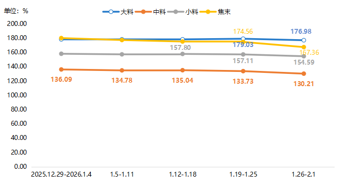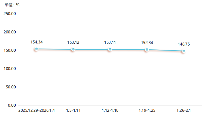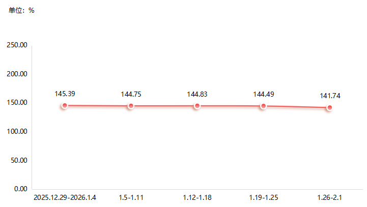 本期(2026.1.26-2.1,下同),神木兰炭市场稳中偏弱。据“神木·中国兰炭产业指数”信息系统监测,本期兰炭产品价格总指数收于141.74点,环比下降1.90%。细分产品中,煤气价格指数持平,大中小料、焦末、重油和轻油价格指数下降。