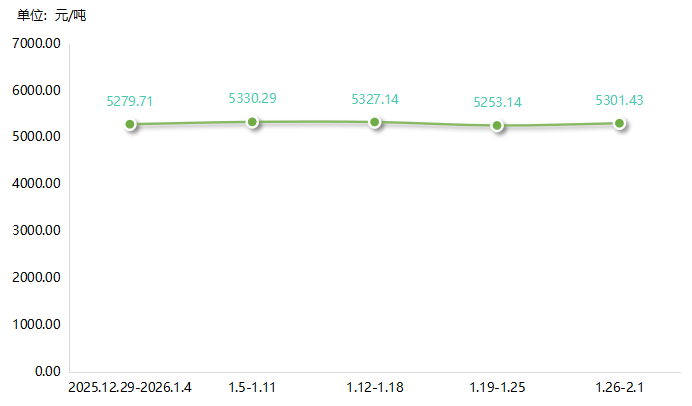本期,硅铁市场均价为5301.43元/吨,环比上涨0.92%。具体来看,近期硅铁市场呈现稳中略涨的态势,但受制于冬储采购趋缓、钢厂需求进入尾声等现实因素,价格缺乏持续上涨的单边驱动,整体维持窄幅震荡格局。