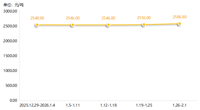 本期,电石市场均价为2586.80元/吨,环比上涨1.21%。分析来看,电石价格稳中偏强运行,其上涨动力主要源于供需格局的阶段性收紧。供应端,内蒙古地区有序用电政策持续加强,陕西、宁夏部分电石炉因故障开工下降,导致整体供应明显收缩,市场货源呈现紧张态势;需求及物流端,北方雨雪天气增多,物流费用上涨且车辆难寻,刺激下游企业积极备货以确保到货,采购需求得到提振。