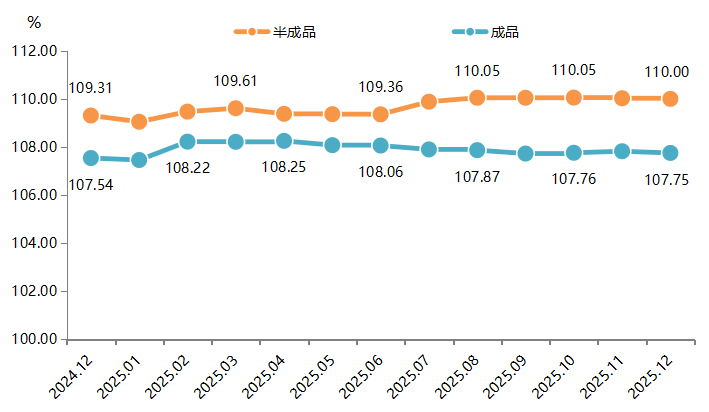 2025年,高阳纺织半成品价格指数同比小幅增长。一季度,受节前备货及海外订单回流驱动,棉纱价格波动上行,带动高阳纺织产品价格指数同步冲高,3月达109.61点的相对高位;二季度,随着贸易政策波动及行业进入传统淡季,棉纱价格有所下降,5月因中美贸易关系短暂缓和有所回暖,6月淡季效应深化,加剧库存压力,导致产品价格指数回落至109.36点;三季度,原料棉花价格上涨被动推高纱价,半成品价格指数因成本支撑走强;进入四季度,传统“金九银十”旺季需求不及预期,新棉丰产预期削弱成本支撑,棉纱价格稳中有降,半成品价格指数整体稳中有降,年末指数同比转正但环比小幅回落。截至12月,指数为110.00点,环比下跌0.02%,同比上涨0.63%。