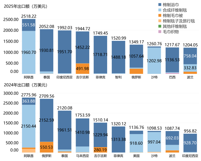 印尼市场2025年从河北省的进口额为1992.03万美元,同比增长108.19%。作为全球重要的人口市场,其纺织品消费偏好日益多元化。在材料上,棉、合成纤维及混纺材料均有广泛需求。具体到产品,鉴于其热带气候和庞大的穆斯林人口,对吸水性强、速干的棉制浴巾以及设计端庄、色彩丰富的合成纤维毯的需求稳定。此外,线上零售渠道的扩张也加速了性价比产品的流通。