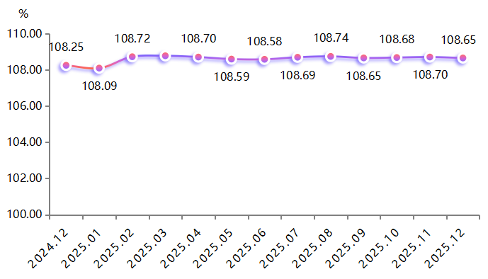 2025年,高阳纺织产品价格指数承压运行,整体呈波动上涨态势,截至12月,指数为108.65点,同比上涨0.37%。