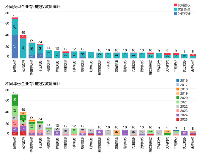 龙头企业创新引领,专利产出呈集聚化特征。高阳纺织核心企业成为专利创新主力军,河北瑞春纺织有限公司(下文简称“瑞春纺织”)、河北宏润新型面料有限公司(下文简称“宏润面料”)等龙头企业专利授权量遥遥领先,形成创新集聚效应。据不完全统计,瑞春纺织以发明专利3项、外观设计专利40项、实用新型专利27项,持续领跑区域纺织产品创新,以专利布局带动产业整体创新能力提升。宏润面料新增授权发明专利6项、实用新型34项。