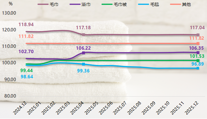 细分来看,2025年,各分项指数同比走势分化,功能性、品质化产品更具价格韧性,而传统品类则面临一定下行压力。其中,毛巾类价格指数在高位小幅回调,12月收于117.04点,同比下降1.60%,反映市场供应充足、竞争加剧导致价格承压;浴巾类指数表现相对坚挺,12月指数为106.35点,同比上涨3.56%,显示消费升级带动中高端浴巾需求持续释放;毛巾被类指数维持温和上行态势,12月指数收报于101.53点,同比上升2.11%,表明季节性备货与产品功能升级支撑价格稳中有升;毛毯类指数同比下滑1.78%,凸显替代品冲击下的价格下行压力;其他类指数始终稳定在111.82点,整体运行平稳。