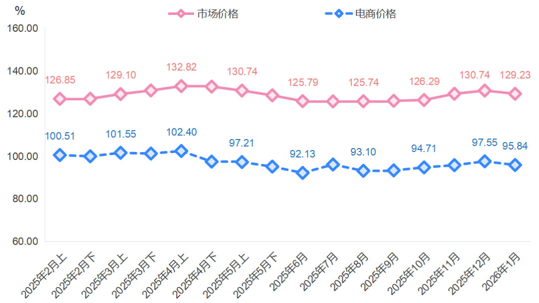 电商价格指数同步调整。1月,电商价格指数收于95.84点,环比下降1.75%。细分品类中,凤梨17号价格指数为79.76点,环比大幅回升17.23%,显示出其在高端线上消费群体中的品牌号召力正逐步恢复。西瓜菠萝价格指数收于75.75点,环比上涨1.05%,健康饮品需求回归常态。小菠萝价格指数虽环比下降7.60%至156.83点,但仍处于相对高位。