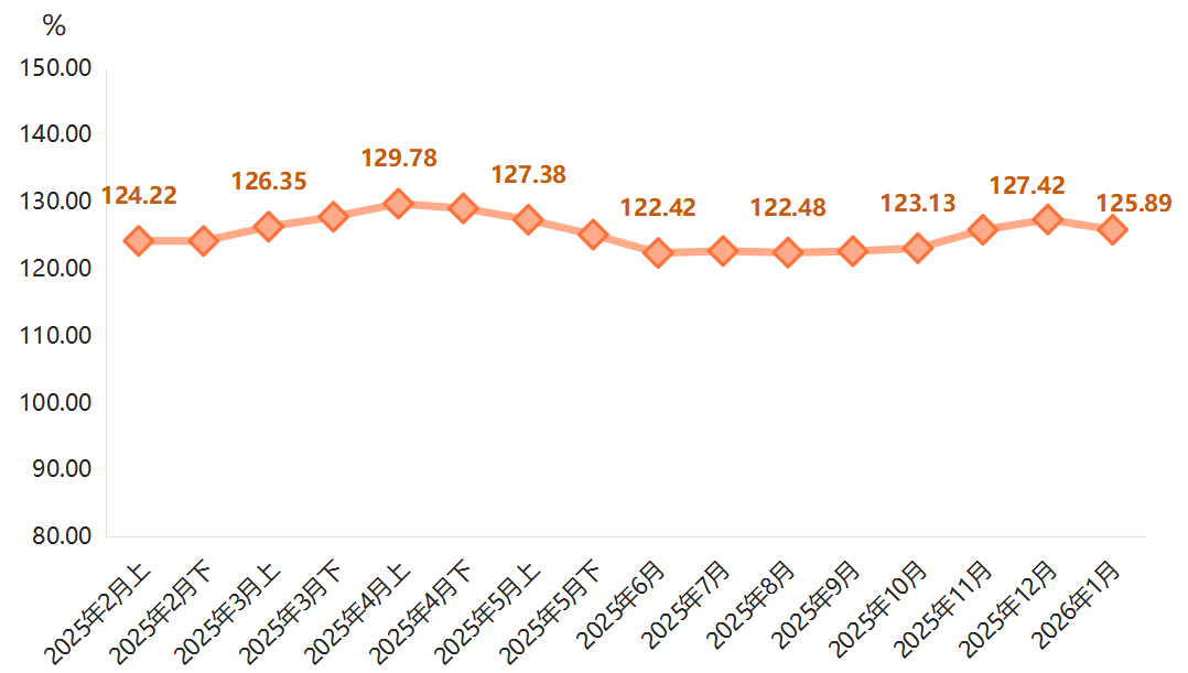 据“徐闻·中国菠萝指数”监测,2026年1月,徐闻菠萝产品价格指数为125.89点,环比微降1.20%,同比上涨1.06%,结束了自2025年10月以来的连续回升态势,进入高位盘整阶段。指数走势如下图所示: