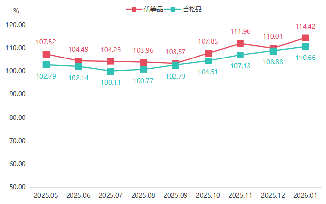 合格品小米价格指数则保持稳定上升态势,1月收于110.66点,环比上升1.63%。该品类主要面向日常家庭消费和大宗采购,随着农历新年临近,居民家庭囤货、餐饮企业集中采购以及企事业单位食堂节前补库等行为明显增多,推动合格品小米价格稳中有升。