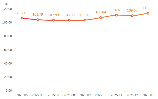2026年1月,武安小米价格重拾上升趋势。根据“武安小米产业指数”数据监测显示,1月小米价格指数收于113.30点,环比上升3.30%。指数具体走势如下图所示:
