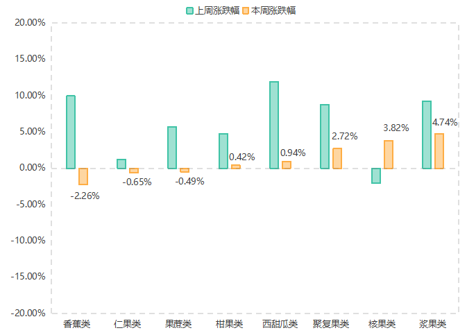 具体品类来看,香蕉类(-2.26%)、仁果类(-0.65%)、果蔗类(-0.49%)水果价格指数本期由升转降;柑果类(0.42%)、西甜瓜类(0.94%)、聚复果类(2.72%)和浆果类(4.74%)水果价格指数本期升幅均有不同程度的收窄;核果类(3.82%)水果价格指数本期止降为升。
