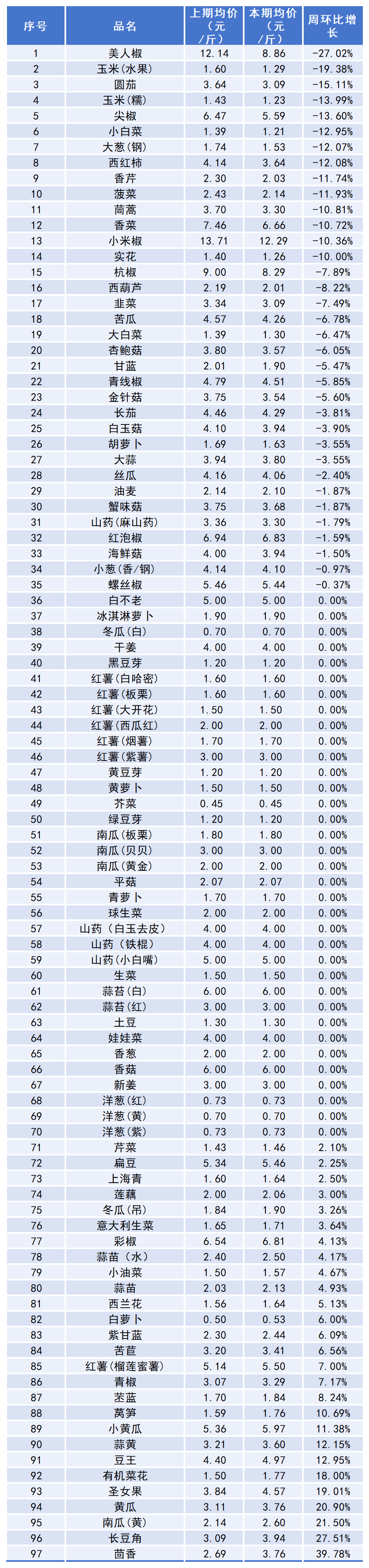四、本期蔬菜价格涨跌表