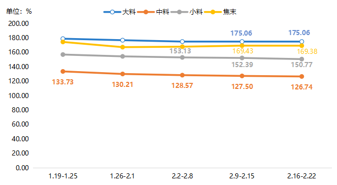 近两期兰炭各细分产品价格指数表现各异。具体来看,大料价格指数持稳运行,指数均收报于175.06点;中料、小料价格指数持续下滑,最近一期指数分别为126.74点、150.77点,环比分别下降0.59%、1.06%;焦末价格指数先涨后降,但整体波动幅度较小,最新一期指数为169.38点,环比略降0.03%。