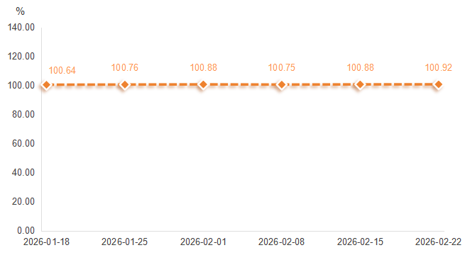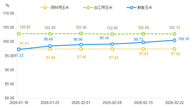 2026年2月第4周(2月16日—2月22日),通辽黄玉米产品价格指数收报于100.92点,环比上涨0.04%。指数具体运行情况如下图所示: