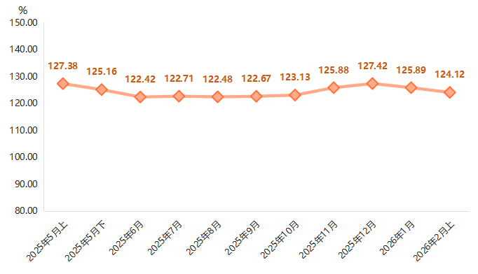 其中,市场价格指数收报于127.50点,环比下降1.34%,电商价格指数收报于93.67点,环比下降2.26%,两项指数均延续了自2025年12月峰值以来的回调态势,表明前期受春节节日效应拉动的价格冲高过程已基本结束,价格水平正从节日高位向正常区间理性回归。值得注意的是,电商价格指数回调幅度略大于线下市场,一定程度上反映出线上渠道对节日消费波动的敏感性更高,需求回落更为明显。