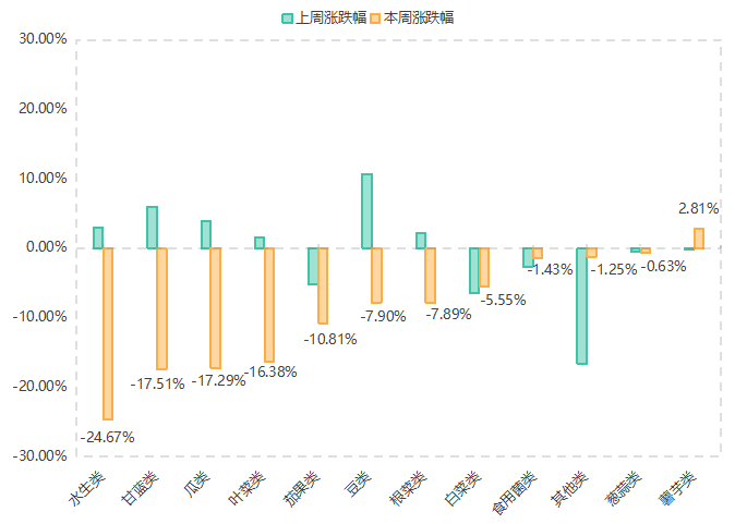 本期监测的12类蔬菜价格指数中,除薯芋类(2.81%)蔬菜价格指数止降为升外,其余11类蔬菜价格指数本期均呈现下降态势。其中,水生类(-24.67%)、甘蓝类(-17.51%)、瓜类(-17.29%)、叶菜类(-16.38%)、豆类(-7.90%)、根菜类(-7.89%)蔬菜价格指数本期均由升转降;茄果类、葱蒜类蔬菜价格指数本期降幅分别扩大至10.81%、0.63%;白菜类、食用菌类、其他类蔬菜价格指数本期降幅则分别收窄至5.55%、1.43%、1.25%。