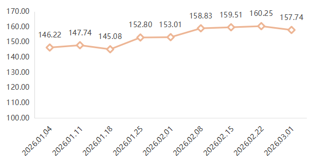 第二阶段(春节后,2月第4周)指数回落至157.74点,环比下降1.57%,主要因节后需求退潮,市场进入季节性淡季调整。
