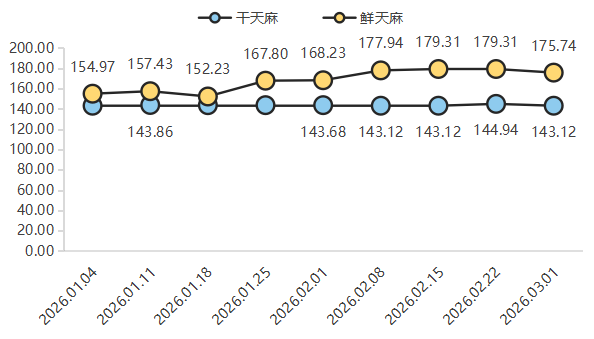 加工端:库存压力未减。干天麻2月份继续面临高库存消化的核心压力,加工企业普遍资金周转压力较大,因此普遍采取“以销定产、谨慎采购”的策略,对鲜天麻的收购态度保守,这也是压制干天麻价格的主要原因。