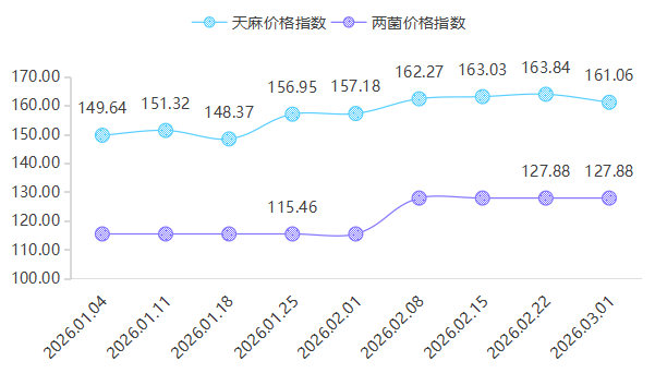 2月第1周,天麻价格指数快速上涨至162.27点,涨幅达3.24%。随后两周春节前后,指数分别在163.03点和163.84点的高位窄幅震荡,节日效应持续。2月第4周,指数回调,环比下降1.70%。
