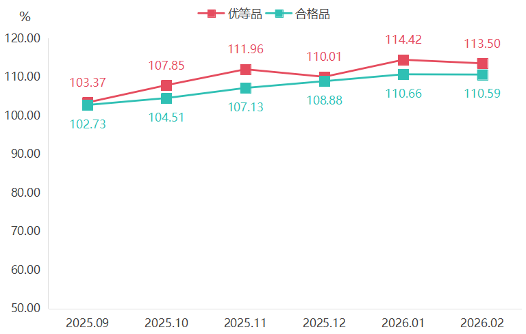 优等品小米——113.50点,比1月微跌0.81%。虽然跌了,但还在历史高位。为啥?春节期间送礼、宴请用的小米,多是这种。节后需求回落正常,但补货的人还在,加上好粮源本来就少,农户也捂着不卖,价格自然下不去。