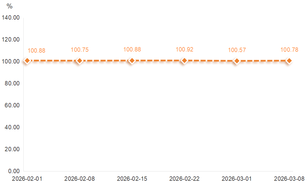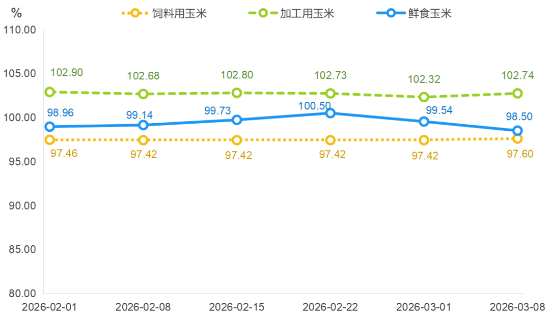 3月第2周(3月2日-3月8日),通辽黄玉米价格指数收报100.78点,环比上涨0.21%