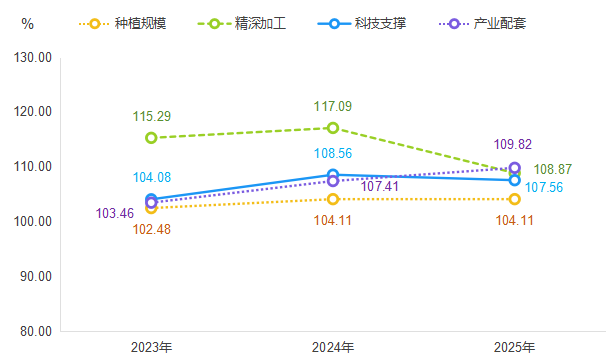 精深加工指数从2024年的117.09点回调至2025年的108.87点,是导致总指数小幅回落的主因。