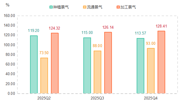 拆开看,种植基本盘稳、加工韧性硬,而流通环节正化身“超级引擎”,撬动新一轮增长。2025年二季度到四季度,流通景气指数稳步上升,收于93.00点。