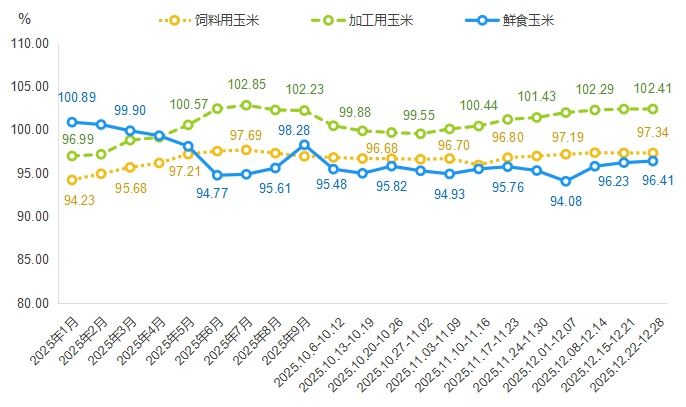 最抢眼的是加工用玉米价格指数——全年高位运行,7月冲到峰值102.85点,年底又回升至102.41点。