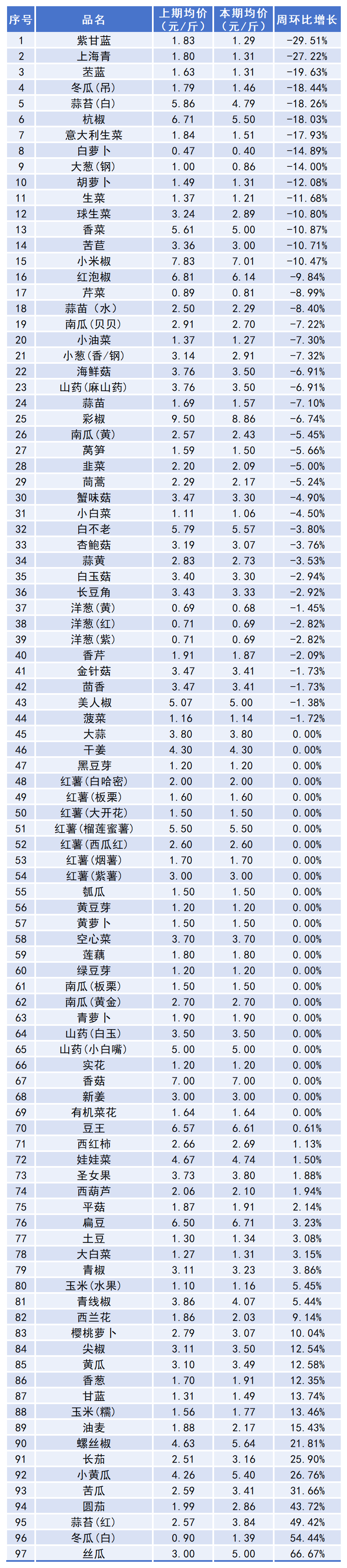 从具体蔬菜品种来看,价格上涨的有28种,占总蔬菜品种28.87%,其中丝瓜本期均价5.00元/斤,上期均价3.00元/斤,环比涨幅达66.67%;价格下跌的有44种,占总蔬菜品种45.36%,其中紫甘蓝本期均价1.29元/斤,上期均价1.83元/斤,环比下降29.51%;本期价格持平的蔬菜有25种。