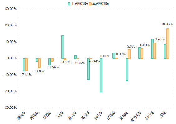 价格指数下降品类:根菜类(-7.31%)、甘蓝类(-1.66%)、葱蒜类(-0.04%)蔬菜价格指数本期降幅均有所收窄;叶菜类蔬菜价格指数本期降幅扩大至5.68%;豆类(-0.72%)、薯芋类(-0.13%)蔬菜价格指数本期由升转降。