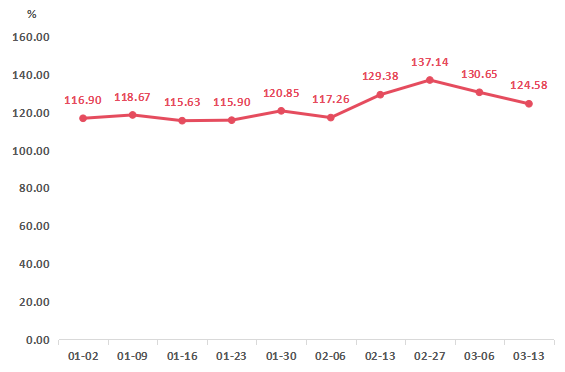 据“南大堡市场蔬果指数”信息系统监测,本期水果(周定基)价格指数持续回落,收于124.58点,环比下降4.65%。