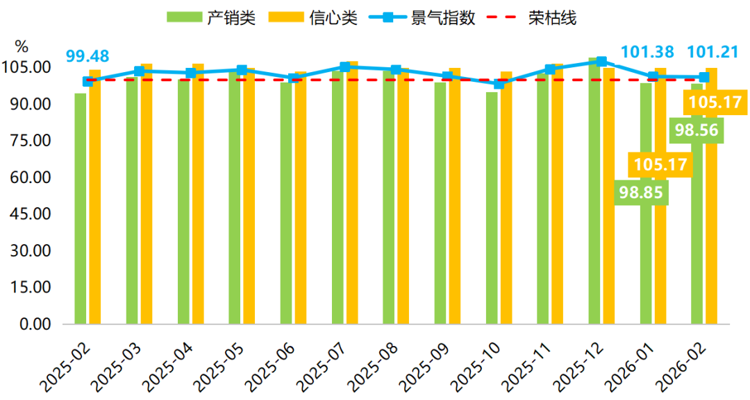 2月产业景气指数101.21点,环比回落,但仍站在荣枯线(100点)之上。
