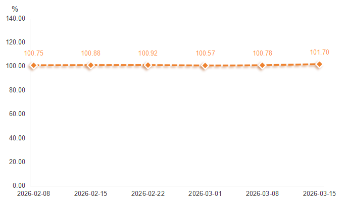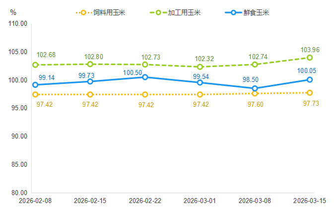 2026年3月第3周(3月9日—3月15日),通辽黄玉米产品价格指数收报于101.70点,环比上涨0.91%,延续了3月以来的上行态势。