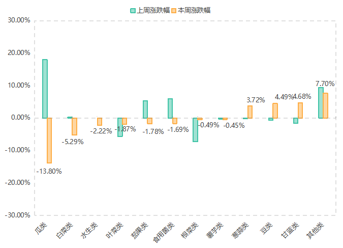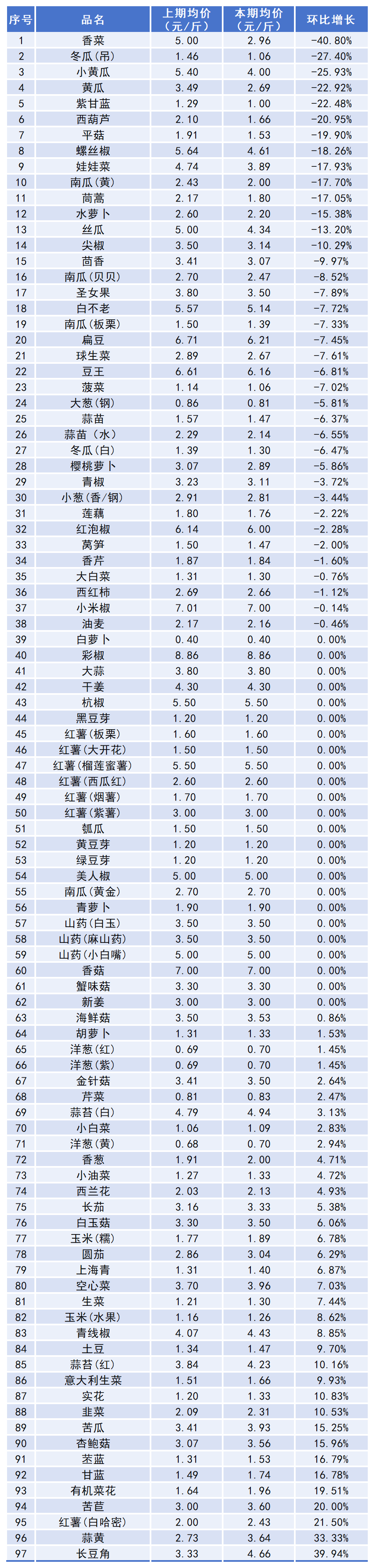 品类方面,监测的12类蔬菜价格指数整体:四升八降。价格指数上升品类中葱蒜类(3.72%)、豆类(4.49%)、甘蓝类(4.68%)蔬菜价格指数本期止降为升,价格指数下降品类中瓜类蔬菜价格指数波动幅度最大。