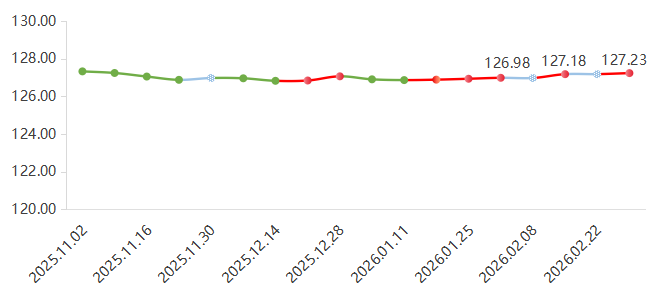 从全月运行轨迹看,指数自1月末的126.98点起步,春节假期指数波动平缓,市场在节日氛围中保持稳定。节后首周,指数在复工补货需求拉动下快速回升至127.18点,单周涨幅达0.16%,成为全月上涨的主要动力。随后两周,指数在127.18-127.23点之间高位窄幅整理,最终收于127.23点,全月累计上涨0.20%。