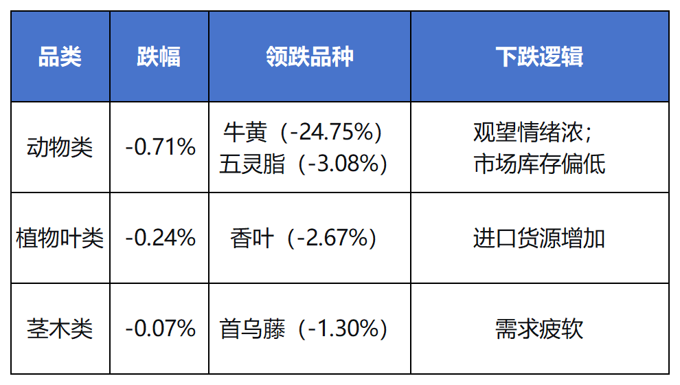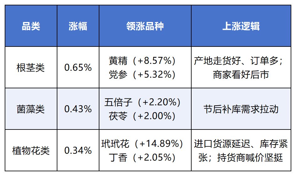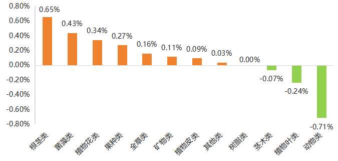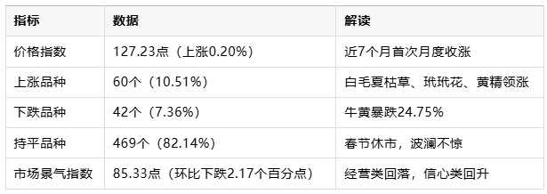 从细分品类看,12个大类呈现8涨1平3跌格局,上涨面大幅扩大。根茎类、菌藻类、植物花类领涨大盘,成为支撑指数上行的核心动力;动物类、植物叶类、茎木类小幅调整,但整体跌幅有限,市场系统性风险已明显释放。