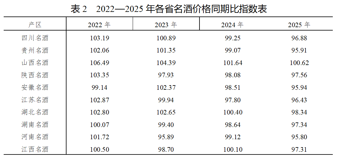2025年,白酒行业仍处于深度调整期,在终端动销不畅,渠道库存高企,电商平台促销“破价”对传统定价体系形成冲击下,全国白酒批发价格环比总指数除7月环比持平外(见表1),其余各月不同程度下跌,跌幅在0.06%~0.38%之间。其中超过半数月份的全国白酒批发价格环比总指数处于2016年以来近十年同期的低点,整体走势偏弱。3月全国白酒批发价格环比总指数为99.94,下跌0.06%,为全年跌幅最小月份;6月全国白酒批发价格环比总指数为99.62,下跌0.38%,不仅是年内低点也是近十年同期的低点。总的来看,在经济下行、政策影响、竞争加剧等多重因素的叠加影响下,白酒行业仍处于深度调整状态,面临巨大的消化库存和稳定价格体系的压力,价格下行成为市场最直接的反映。2025年,全国白酒批发价格环比总指数走势也成为本指数编制以来最弱的一年。
