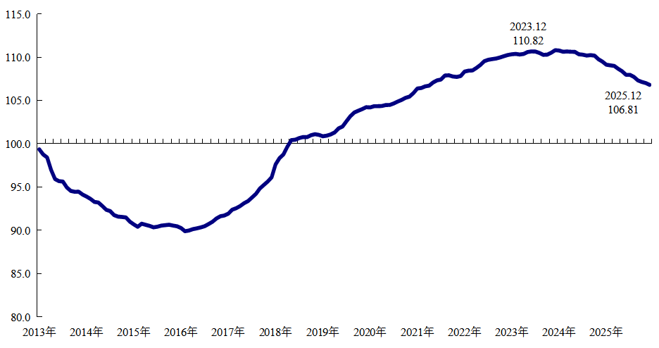 从判断价格长期运行趋势的定基比指数看,全国白酒批发价格定基比总指数勾勒出行业调整—复苏—繁荣—调整的轮回曲线。自2018年5月全国白酒批发价格定基比总指数达到100.42,首次转正后,全国白酒批发价格定基比总指数便开启了“慢牛行情”。定基比总指数自2023年12月达到新高后,涨幅逐步收窄。2025年,涨幅继续收窄,年底12月已回落至106.81,恢复到2021年年初水平,五年涨幅基本抹平。目前白酒价格总体呈下行调整态势,全国白酒批发价格定基比总指数正在构筑一个圆弧顶(见图2),基本可以确立价格拐点已经出现,在企稳回升前,也意味着行业调整仍将继续。