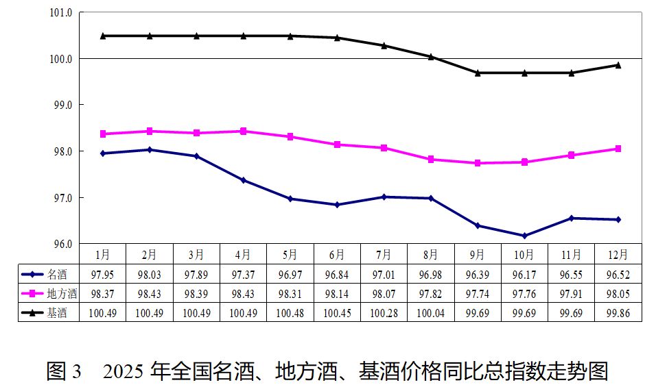 2025年,在渠道库存高企及消费者理性回归的背景下,以茅台、五粮液为代表的高端名酒回归消费属性,价格炒作失去市场,虚高价格失去支撑,出现回落。而随着大众消费趋向理性,优质优价的光瓶酒受到追捧,中低端白酒价格相对稳定,使得地方酒展现出一定的价格韧性。与此同时,虽然白酒市场需求不足,产量在不断下滑,但基酒价格表现仍相对平稳。从环比来看,名酒持续承压、地方酒涨跌互现、基酒略稳;从同比来看,名酒跌幅最深、基酒微涨、地方酒韧性强;从定基比来看,名酒回落幅度大于地方酒、基酒。