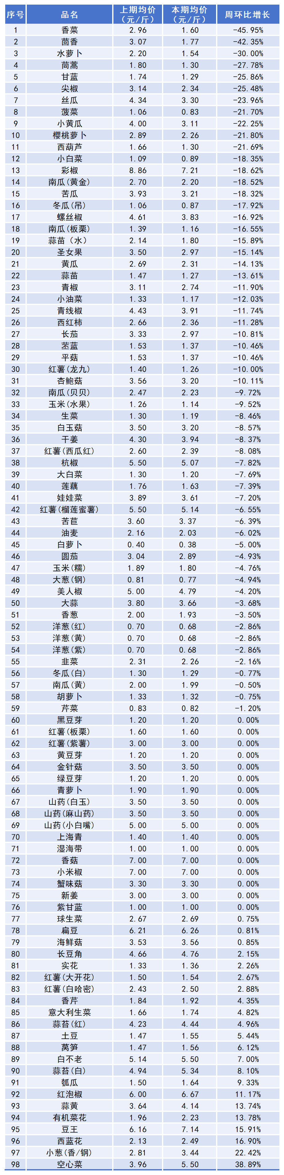 价格上涨的有22种,其中空心菜环比涨幅达38.89%;价格下跌的有59种,其中香菜环比下降45.95%;持平的有17种。