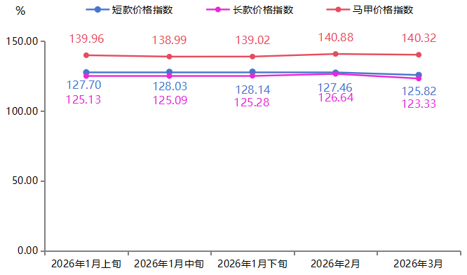 短款价格指数:125.82点,环比下跌1.28%。作为基础款单品兼具保暖与轻便属性,倒春寒天气下仍有刚需。