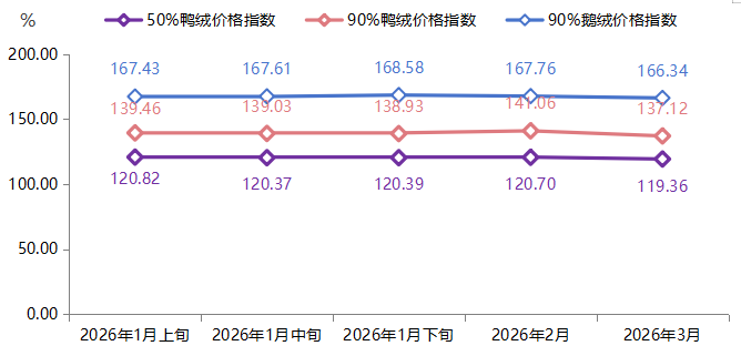 90% 鸭绒价格指数:137.12点,环比下跌2.80%。(供给宽松 + 需求偏弱)