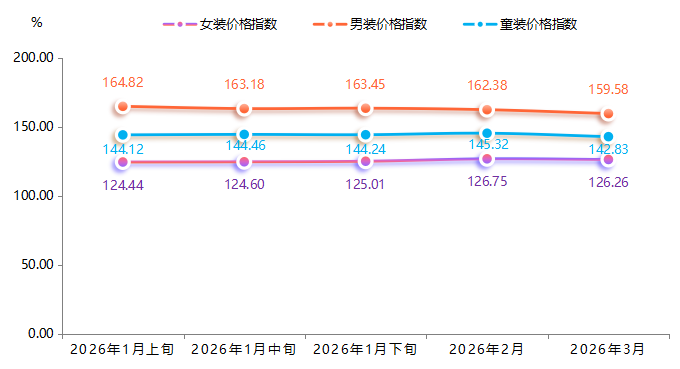 女装价格指数:126.26点,环比下跌0.39%。主要得益于功能性、设计感产品的支撑。