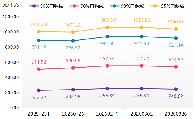 95% 白鹅绒:1040.66 元 / 千克,环比下降2.18%