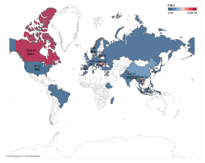 进口前三为加拿大、罗马尼亚、越南,三者进口金额约占总进口额的58.92%。