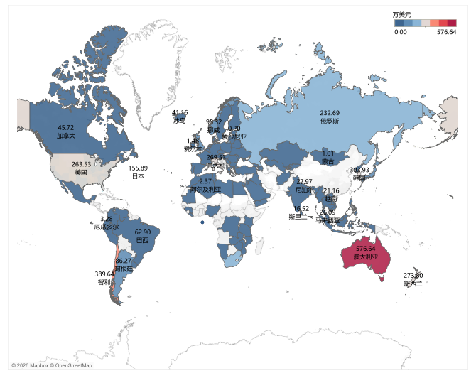 出口前三:澳大利亚、智利、韩国,三者约占总出口额的29.45%,且对欧美及东亚地区的出口集中度较高。