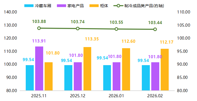2月,成品类制冷产品价格指数有所下行,环比下降0.11个百分点。