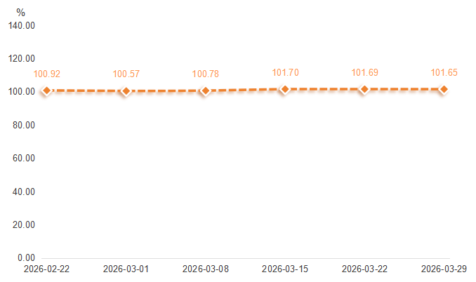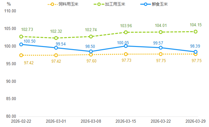 2026年3月第5周(3月23日—3月29日),通辽黄玉米产品价格指数收报101.65点,环比下跌0.04%,市场转入高位震荡、多空博弈阶段,价格上行乏力、下跌空间受限,整体呈僵持态势。