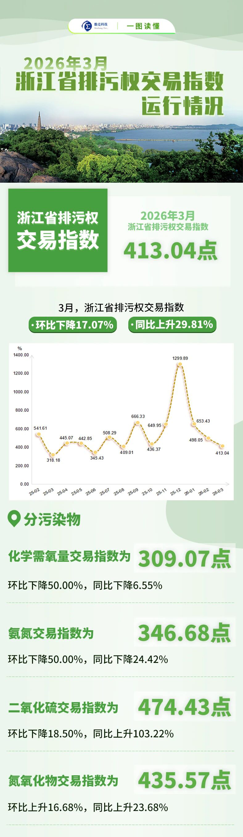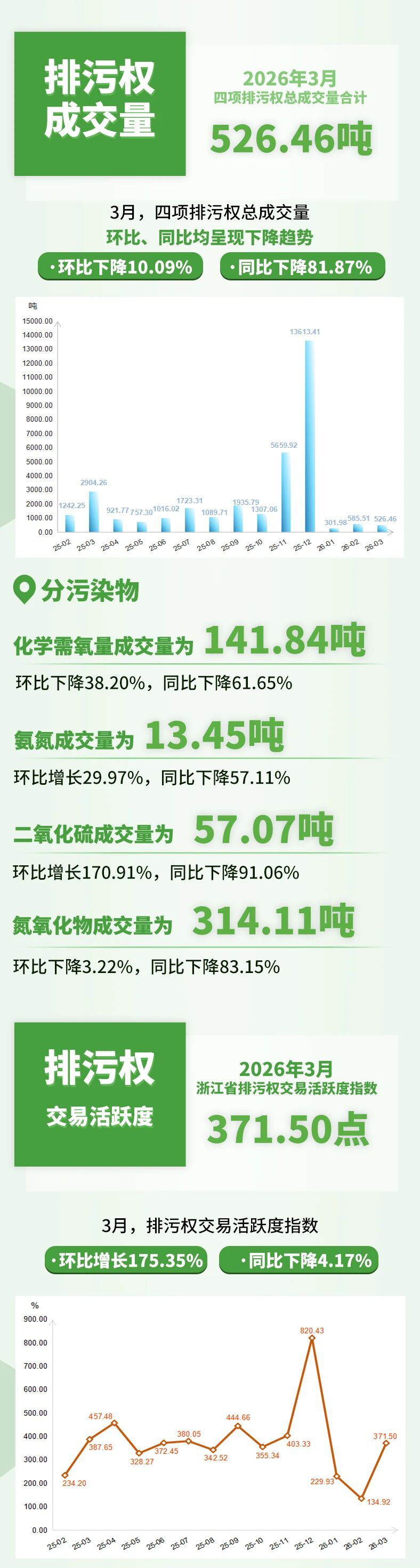 指数看点:2026年3月,浙江省排污权交易指数环比下降17.07%,同比上升29.81%。COD(化学需氧量)、NH3-N(氨氮)、SO2(二氧化硫)、NOx(氮氧化物)四种主要污染物交易指数环比“三降一升”,同比“两降两升”,四项排污权总成交量环比下降10.09%,同比下降81.87%。此外,浙江省排污权交易活跃度环比增长175.35%,同比下降4.17%。