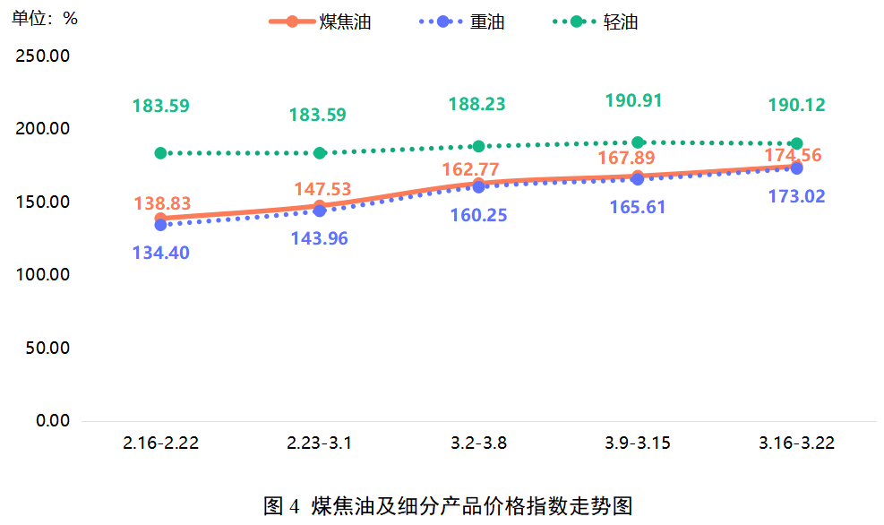 本期,煤焦油价格指数收报于174.56点,环比上升3.97%。分析来看,近期煤焦油价格持续上涨,主要受多重利好因素共同驱动。一是国际油价延续涨势,从成本及情绪层面为市场提供了有力支撑。企业在成品价格上涨的背景下,对煤焦油的挺价惜售情绪强烈,控量出货进一步加剧了货源紧张局面。二是下游需求表现旺盛,深加工及炭黑等行业采购积极,推动市场成交重心不断上移。在买涨心态影响下,市场高位成交增多,整体交投氛围向好,预计短期市场仍将维持强势运行态势。细分产品中,重油价格指数维持偏强运行走势,本期涨幅为4.47%;轻油价格指数环比下降0.42%,略有回调。